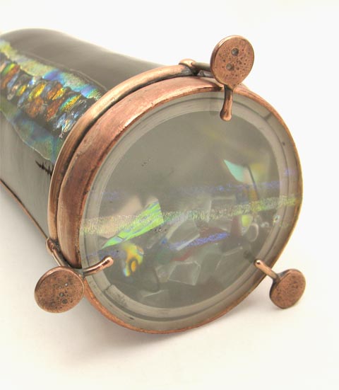 The object cell features a dichroic fused treatment and contains all handworked pieces of glass, creating incredibly random and intricate images.