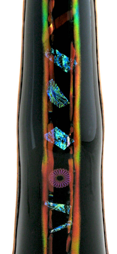 The exterior body of Magnum C is black glass with 2 dichroic stripes surrounding assorted dichroic pieces, fused vertically along the body and then all encased in clear glass.
