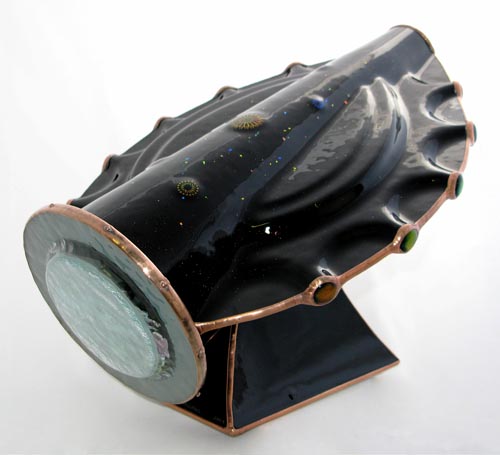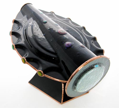 "Odyssey" was created for the exhibition at the American Folk Art Museum. The body is multi-dimensional fused and slumped glass with a bearing mounted, free-turning, slumped glass object case containing specially made lampworked, fused and handcut glass. A tapered two-mirror system produces perfect 10-point images.