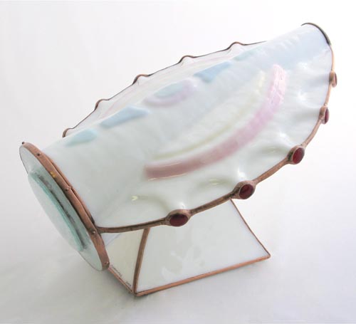 "Odyssey" is a limited edition of 5. Three are black with fused dichroic embellishments and two are white with hand painted color added to provide a subtle accent to the body.