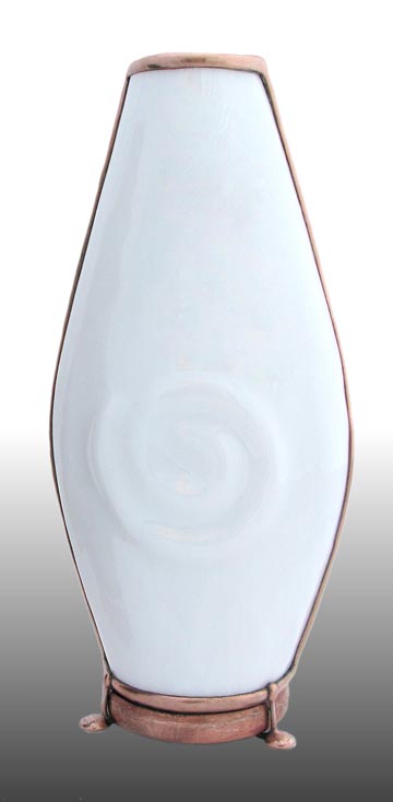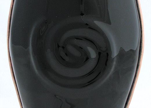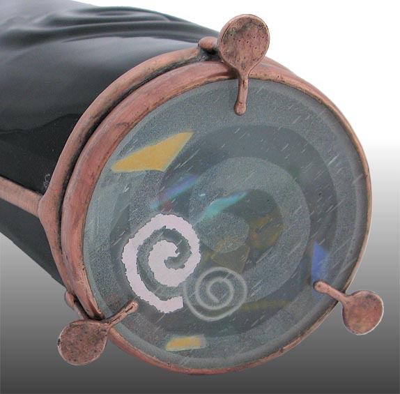The body of the scope is slumped glass with an embossed spiral design on both sides, available in either black or white. A tapered two-mirror system, combined with a modified 3rd mirror, creates a large 12-point image, that suggests an interesting spiraling effect. The dry object case has been sandblasted to provide a soft spiral background and contains lampworked glass, many of which are twisted to compliment the spiral theme.