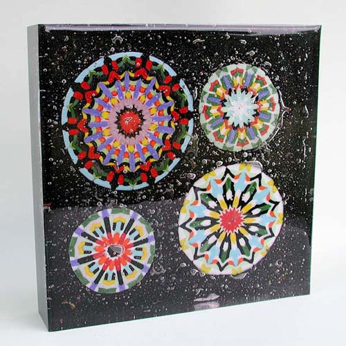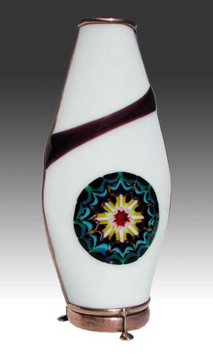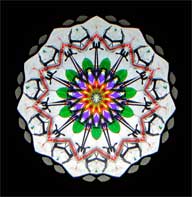 In a kaleidoscope related area, Charles is now creating multilayer fused paperweights and glass sculptures. The same technique he used to produce the decorative mandalas on the "Karascope", "Mandala White", and "Mandala Black" is being applied to these beautiful pieces. |
