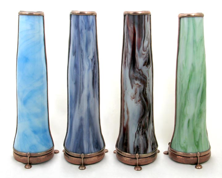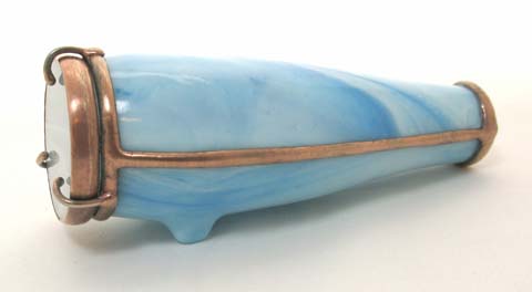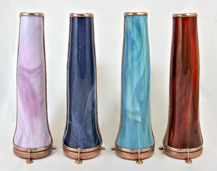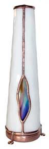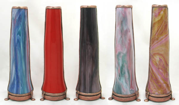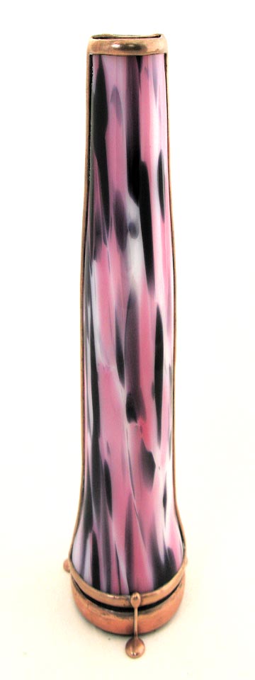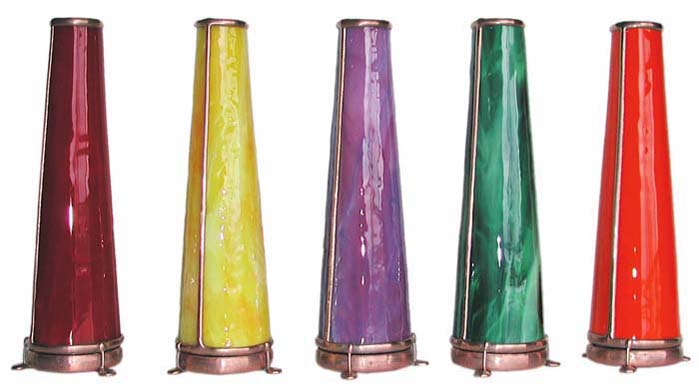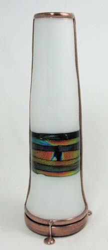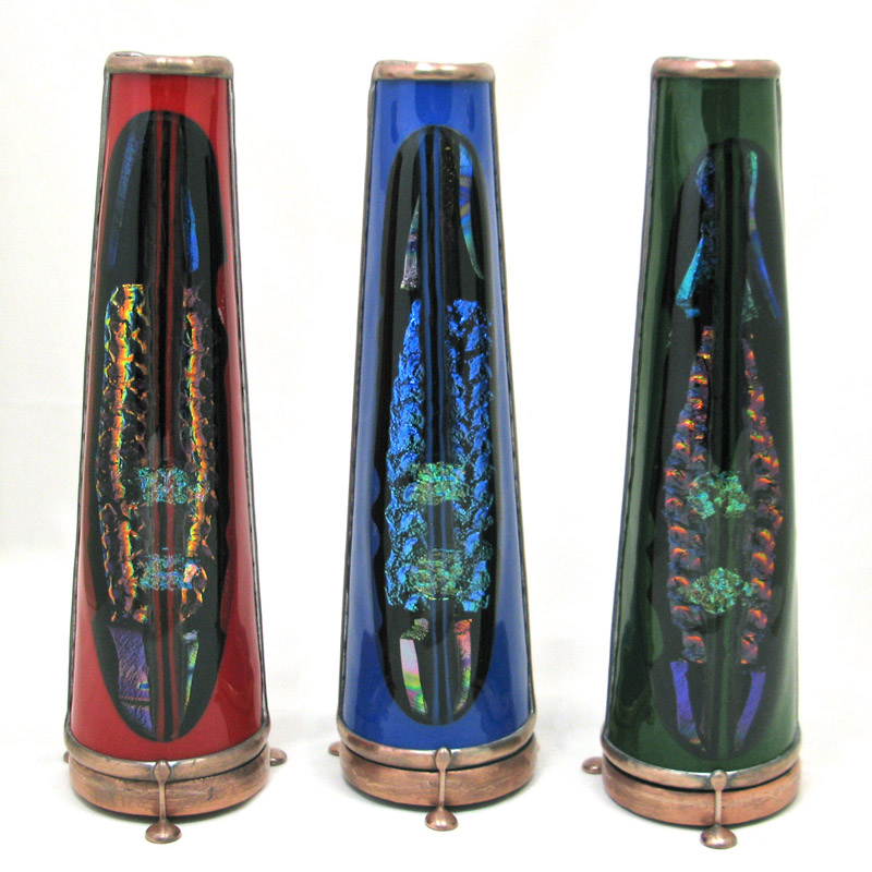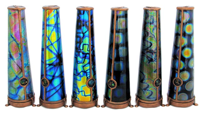 With a cone-shaped, slumped glass body, Luminosity is special in its own way. The exterior glass is very textured and somewhat translucent and has been treated, producing a soft pastel gradient effect throughout the entire body of the scope. The dry object case is a combination of 2 different iridescent glasses with selected surfaces ground off to produce a soft, pastel cast over and behind portions of a crisp 9-point image. (2-mirror system). 10” tall