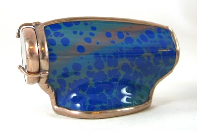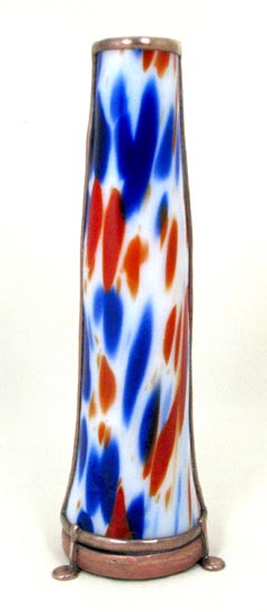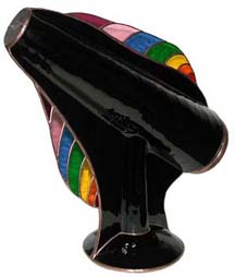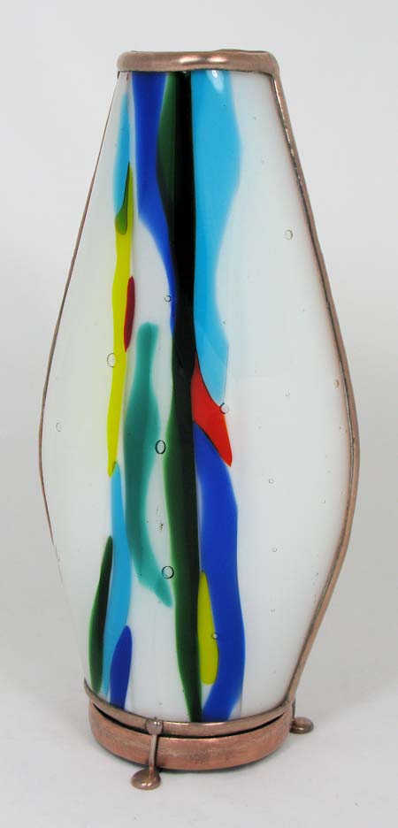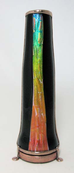 This one-of a kind kaleidoscope was created as a tribute to Cozy Baker as part of the silent auction held at the Brewster Kaleidoscope Society's convention in Covington Kentucky, May 12-15, 2011. Featured are numerous glass working techniques. The body is fused and slumped glass over a multi-dimensional form, representing the colorful fashions Cozy often wore. A tapered two-mirror system provides a large 9 point image. The dry object case contains lampworked, fused, and handcut glass, plus dry glass ampules. The scope stands 10” tall. A matching fused and slumped mask and pendant are part of this tribute to Cozy. Recipient of the People's Choice Award