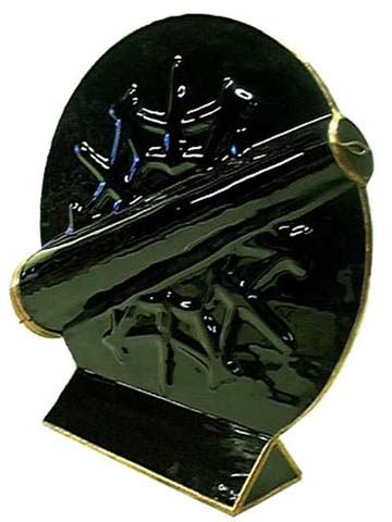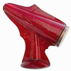 A stylish, fully slumped glass body, stands 14” tall and 12” long, and features an exquisite 10-point, 2-mirror image, with a lens built in the eyehole for improved viewing. Available in black, white, or red. |