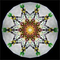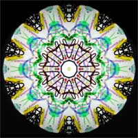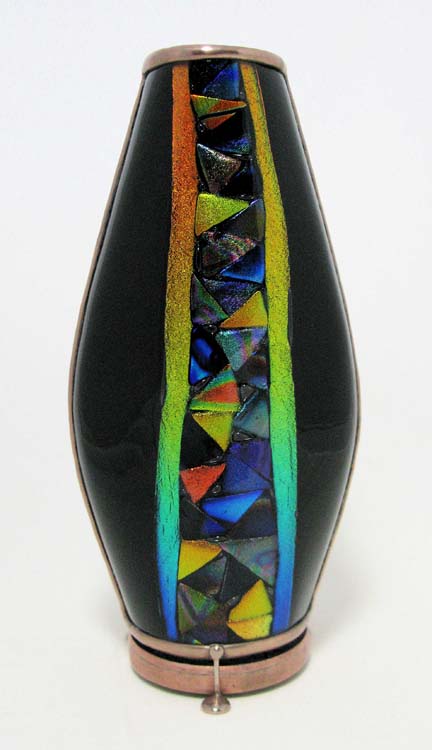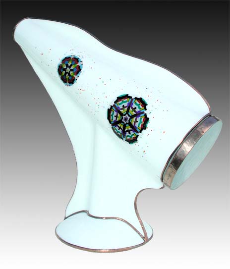 The exterior is fused multi-colored glass, surrounding the symbol for infinity, and then slumped into an appealing flask shape. Perfect 11 point images are produced by the tapered 2-mirror system. All the glass in the dry, free-moving object cell has been selected to create ”over an infinite“ number of very colorful images and is framed by “more infinity”.