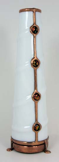 The object case is treated with gold enamel fused to the cell producing a golden background for the lampworked objects.