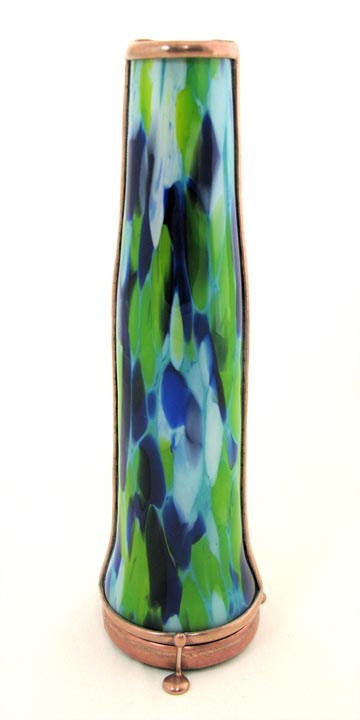 The body of this one-of-a-kind kaleidoscope is multi-colored and multi-layered fused and slumped glass.