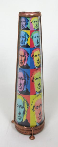 Inspired by the paintings of Andy Warhol, multiple images of Sir David Brewster decorate the exterior slumped glass cone. A tapered 2-mirror system produces 12 point images, with a red panel as the third side. The object cell contains 3 separate chambers, one including a portrait of Sir David, one containing glass beads, and the third filled with lampworked glass. 10“ tall